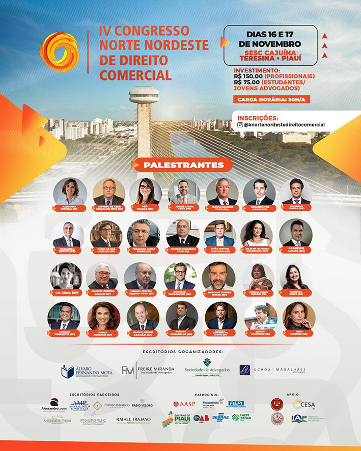 Acontece nos próximos dias 16 e 17 de novembro, o IV Congresso Norte-Nordeste de Direito Comercial, o evento será realizado no SESC Cajuína. Agronegócio, recuperação judicial, disputa entre sócios e registro de empresas estão entre as temáticas.