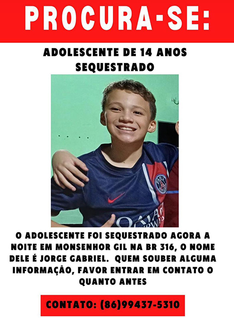 Um adolescente de 14 anos, filho de um empresário, foi sequestrado na noite desta quinta-feira (26), por volta das 21h, no município de Monsenhor Gil, a 59 km de Teresina.