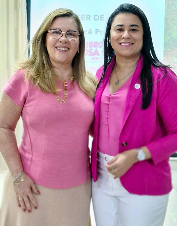 Madrinha do Outubro Rosa, a empresária Claudia Claudino, e a Vice-Presidente de Administração e Finanças do CRC-PI, Leonice Benício, durante a palestra com o tema ‘O que você precisa saber’, em alusão ao Outubro Rosa. O evento destacou a importância da conscientização e prevenção do câncer de mama.
