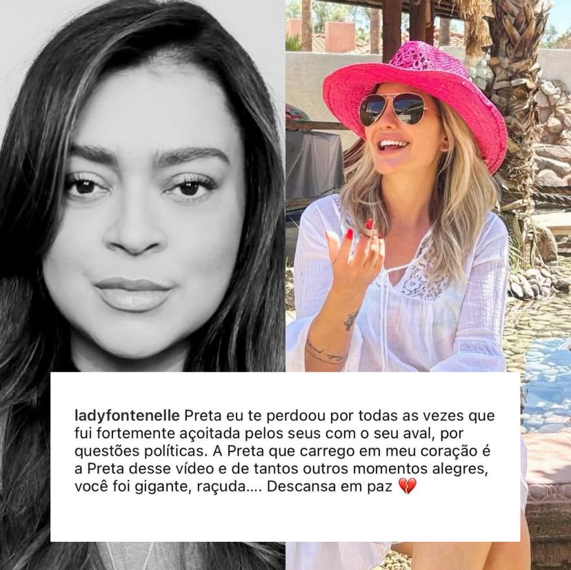 A apresentadora e influenciadora Antonia Fontenelle publicou em seu perfil no Instagram um vídeo antigo em que aparece ao lado de Preta durante o Carnaval. Na legenda, escreveu: “Preta, eu te perdoo por todas as vezes que fui fortemente açoitada pelos seus, com o seu aval, por questões políticas. A Preta que carrego em meu coração é a Preta desse vídeo e de tantos outros momentos alegres. Você foi gigante, raçuda… Descansa em paz”.