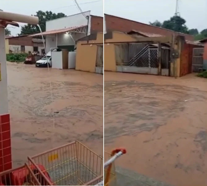 Vídeos compartilhados por moradores nas redes sociais mostram o grande volume de água invadindo ruas, casas e dificultando o deslocamento da população.
