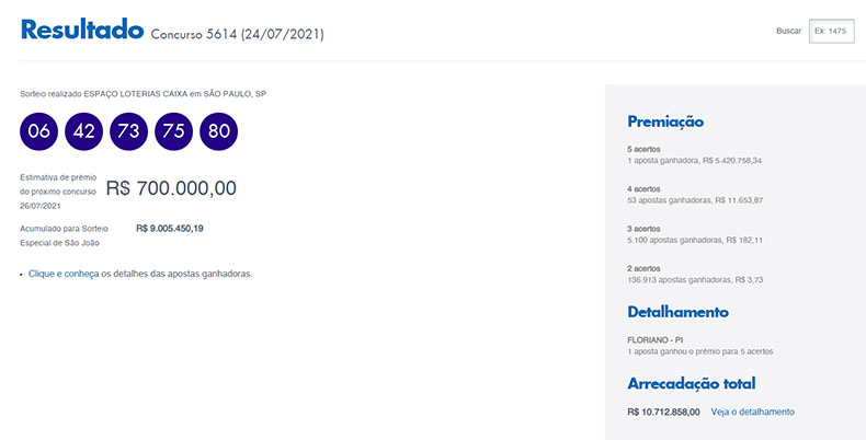 Um apostador da cidade de Floriano, a 244 km ao Sul de Teresina, acertou sozinho as 5 dezenas da Quina e faturou o prêmio de R$ 5.420.758,34. O concurso 5614 foi realizado na noite deste sábado (24) no Espaço Loterias Caixa, em São Paulo.