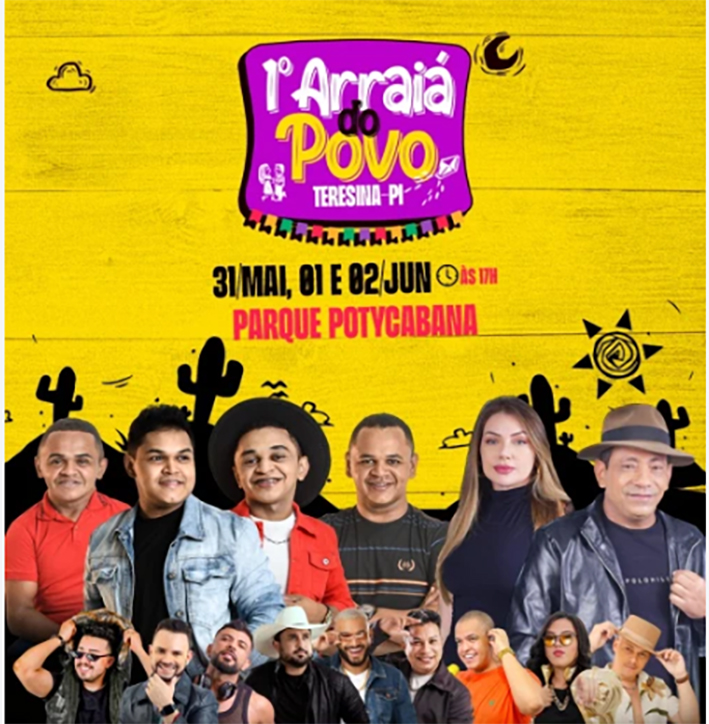 Começa nesta sexta-feira (31) e vai até o próximo domingo (02) o Arraiá do Povo, evento que vai trazer diversas atrações do cenário do forró para Teresina. Ao todo, 10 atrações vão subir ao palco do Parque Potycabana durante os três dias para trazer o clima junino para a capital. A entrada no espaço para curtir os shows e também a parte destinada às crianças serão gratuitas.