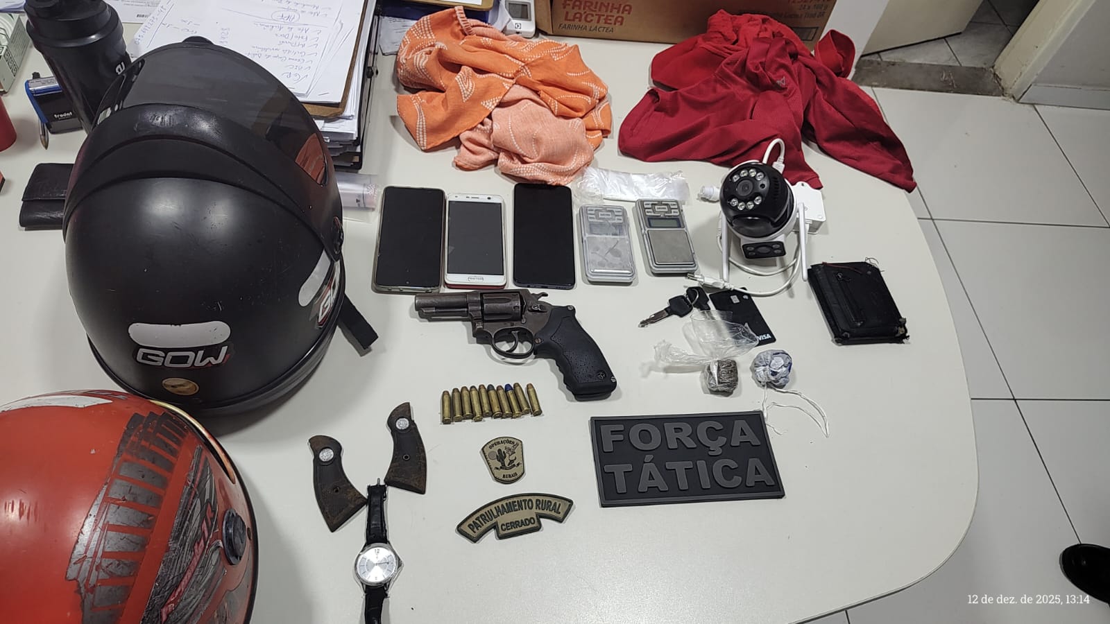 De acordo com a PM, o homem detido confessou o crime. Com o casal, foram apreendidos celulares, uma arma de fogo, munições, drogas, balanças de precisão, uma motocicleta e outros materiais utilizados na ação.