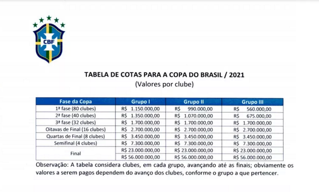 Por conseguirem a classificação às oitavas na Copa do Brasil, os clubes garantem uma cota de R$ 2,7 milhões. Se avançaram até as quartas, garantem R$ 3,45 milhões. Não há divisão por grupos a partir desta fase.
