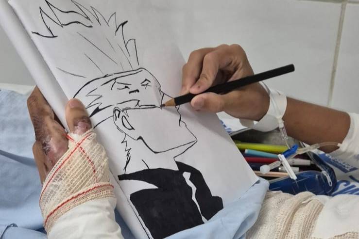 Com 60% do corpo queimado, K.R.G.S, de 14 anos, está se recuperando e o desenho tem ajudado a superar os dias de internação longe dos amigos. Com o material recebido, as crianças desenham o que tem ajudado a passar o tempo. Já