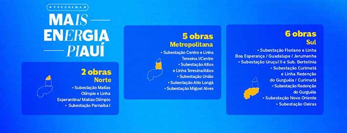 Para o futuro, a Equatorial Piauí anuncia investimentos fortes para o período de 2023-2024. Serão 13 conjuntos de obras que vão beneficiar os mais diversos segmentos econômicos do estado. No infográfico abaixo, é possível conferir cada uma das obras que serão entregues até o próximo ano.