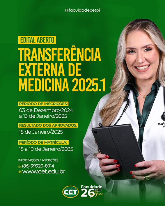 FACULDADE CET ABRE INSCRIÇÕES PARA TRANSFERÊNCIA EXTERNA EM MEDICINA 2025.1