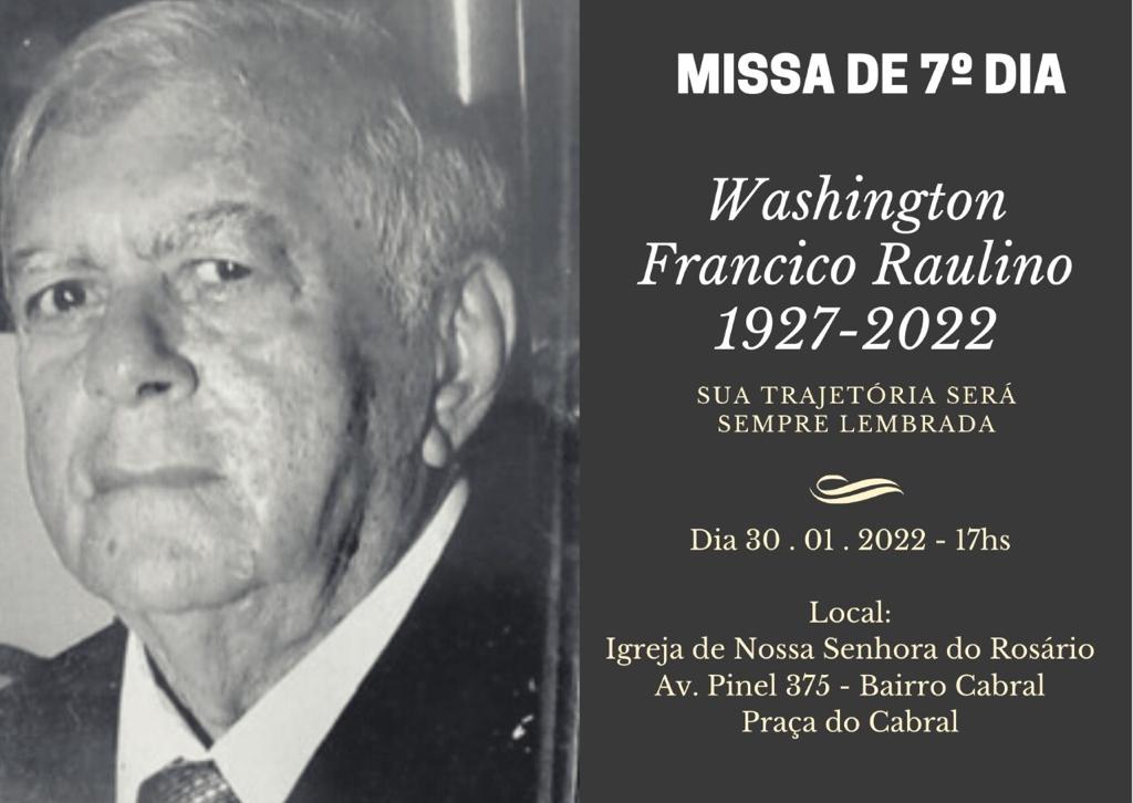 Familiares e amigos convidam a todos a prestarem a última homenagem ao Drº Washington Raulino, em sua missa de 7º dia.
