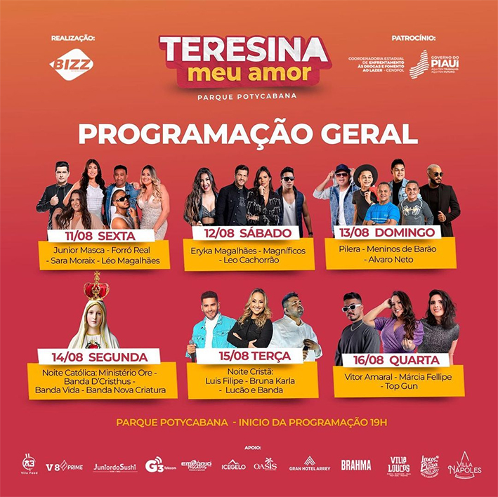 Entre os dias 11 a 16 de agosto, o Parque Potycabana receberá o Festival “Teresina, meu amor”, em comemoração ao aniversário da capital piauiense.
