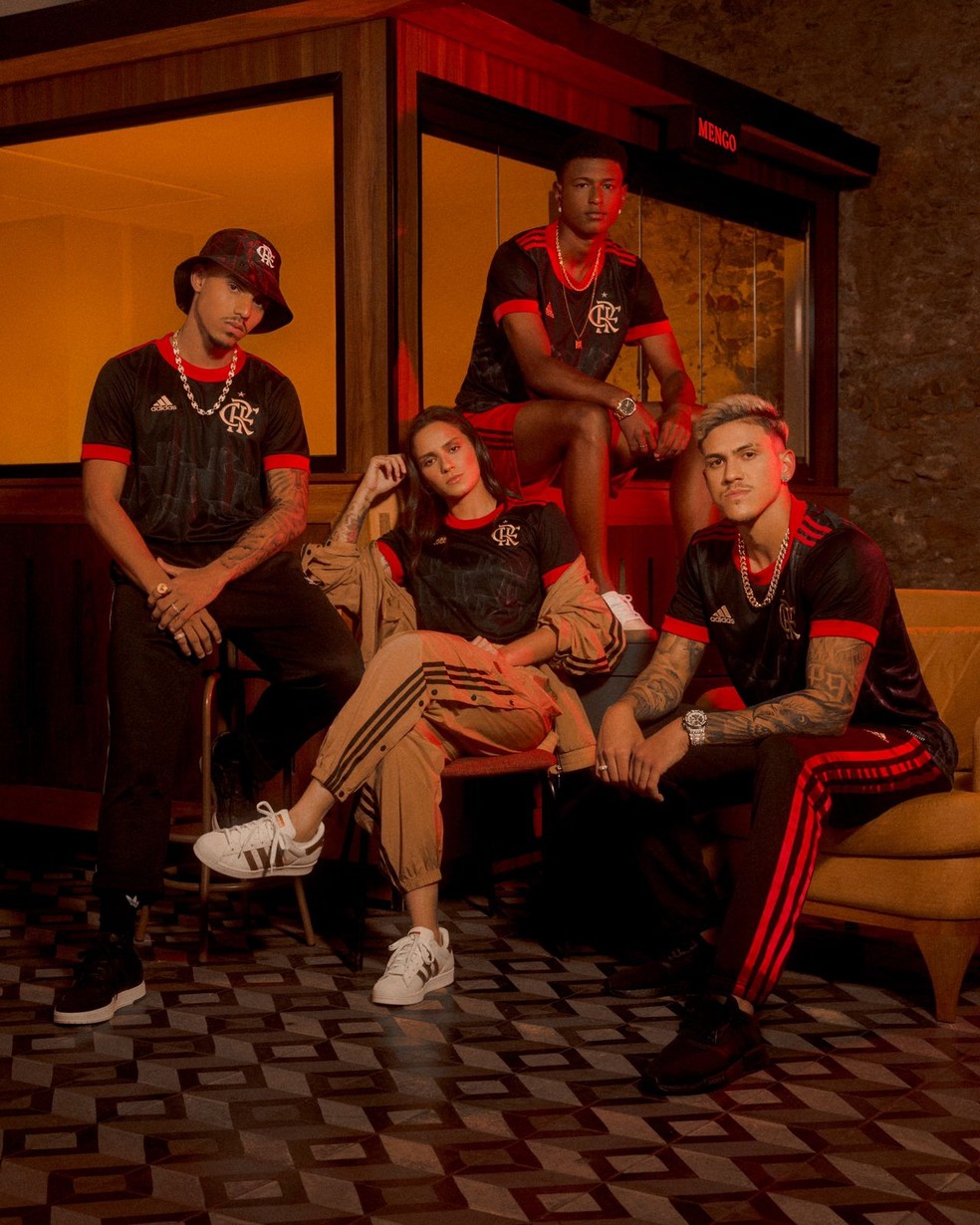 A camisa é predominantemente preta, com detalhes em dourado e vermelho e grafismos especiais. Jogadores do elenco, como o atacante Pedro e o lateral Matheuzinho, se juntaram ao atacante Bill, do sub-15, e aos artistas Papatinho e MC Rebecca para estrelar o lançamento.
