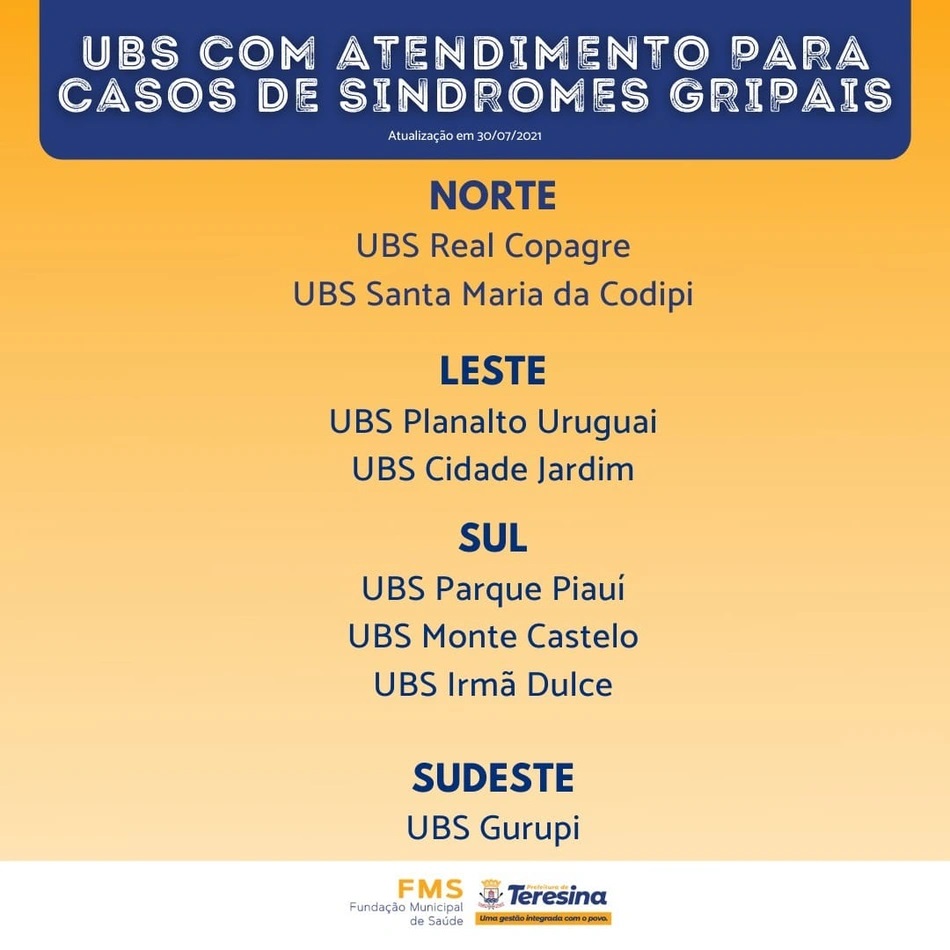 A população de Teresina tem agora oito Unidades Básicas de Saúde (UBSs) que dão assistência exclusiva a casos de síndromes gripais leves. Essas unidades utilizam o “Fast-track”, protocolo do Ministério da Saúde para agilizar os atendimentos. Além dessas oito UBSs, Teresina conta com mais 84 UBS que estão atendendo pessoas com outras doenças.