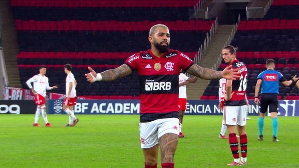 Gabigol foi julgado nesta sexta-feira no STJD e punido com duas partidas de suspensão por aplaudir ironicamente (um jogo) e chamar o futebol brasileiro de “várzea” (um jogo) após ser expulso na derrota por 4 a 0 para o Internacional, pela 15ª rodada do Brasileiro. Ele já cumpriu um jogo e fica ausente do duelo com o Grêmio, neste domingo, mas o Flamengo vai tentar o efeito suspensivo para que ele possa estar em campo.