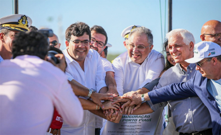 O governador Rafael Fonteles chegou acompanhado do vice-governador Themistocles Filho, do presidente da Alepi, Franzé Silva (PT), do presidente do Tribunal de Justiça do Piauí, Hilo de Almeida, do capitão dos Portos do Piauí, José Eduardo, da prefeita de Luís Correia, Maninha Fontenele, além de outras autoridades, e fez o descerramento da placa que marcou o início do funcionamento do porto.