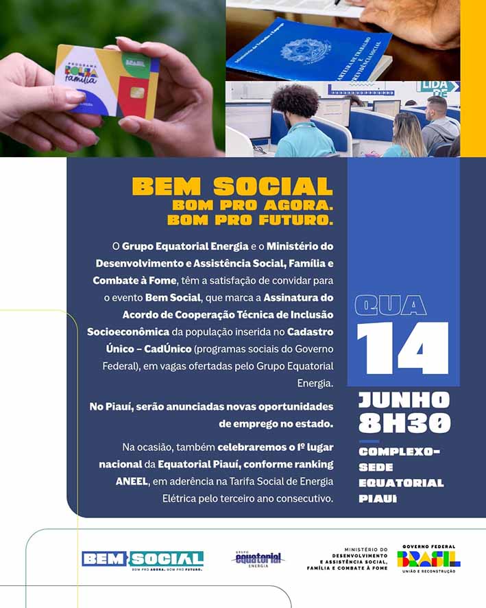 O Grupo Equatorial Energia, em parceria com o Ministério do Desenvolvimento e Assistência Social, Família e Combate à Fome (MDS), lança oficialmente o projeto “Bem Social” no Piauí. A iniciativa busca gerar empregos para os beneficiados do programa Bolsa Família. Nesse primeiro momento, serão anunciadas 1.700 oportunidades de emprego nos municípios de Teresina e Ribeiro Gonçalves.