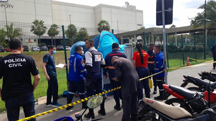 A vítima estava parada na calçada do shopping quando foi surpreendida pelos atiradores e atingida pelos disparos.