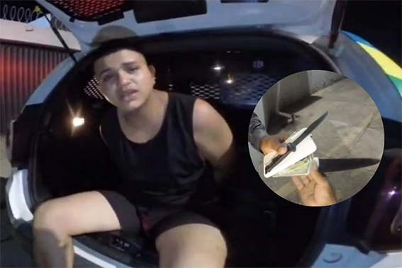 Os policiais foram acionados por vizinhos e, ao chegarem à residência, encontraram o suspeito armado com uma faca, em atitude agressiva. Após negociações, os agentes conseguiram imobilizá-lo e apreender a arma branca, evitando que o crime fosse consumado.