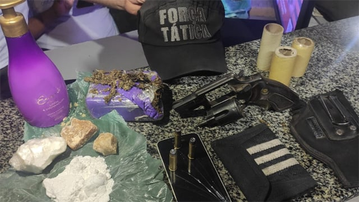 A PM apreendeu 1 revólver calibre 38, 3 munições intactas calibre 38, 50 gramas de crack, 1 celular, 103 gramas de cocaína e 360 gramas de maconha.