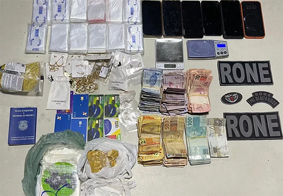 Na casa, o Rone encontrou duas balanças de precisão, 17 pacotes de sacos de abalagem, 17 embalagens com joias; pasta base de cocaína; seis celulares e $ R$ 8.618,60 em dinheiro trocado.