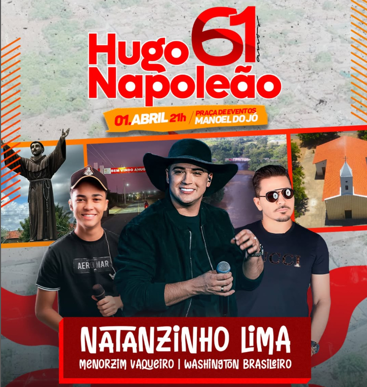 No dia 1º de abril, a cidade estará em festa para comemorar essa data tão especial! E a celebração será inesquecível, com grandes atrações: Natanzinho Lima, Washington Brasileiro e Menorzim Vaqueiro animando a noite!
