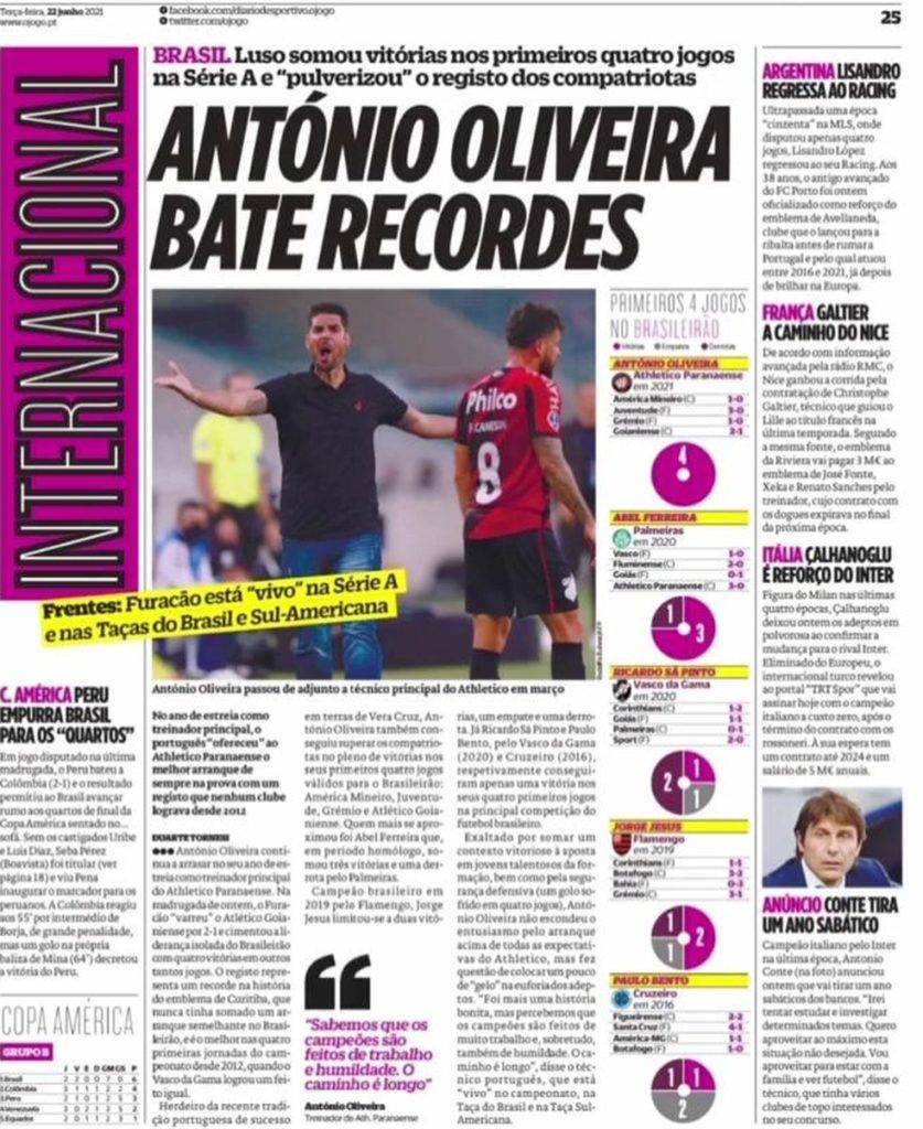 O jornal português “O Jogo” destacou o início da passagem do técnico António Oliveira no Campeonato Brasileiro pelo Athletico. O periódico ainda comparou o jovem treinador com sucessos recentes de Abel Ferreira, pelo Palmeiras, e Jorge Jesus, ex-Flamengo e atualmente no Benfica.