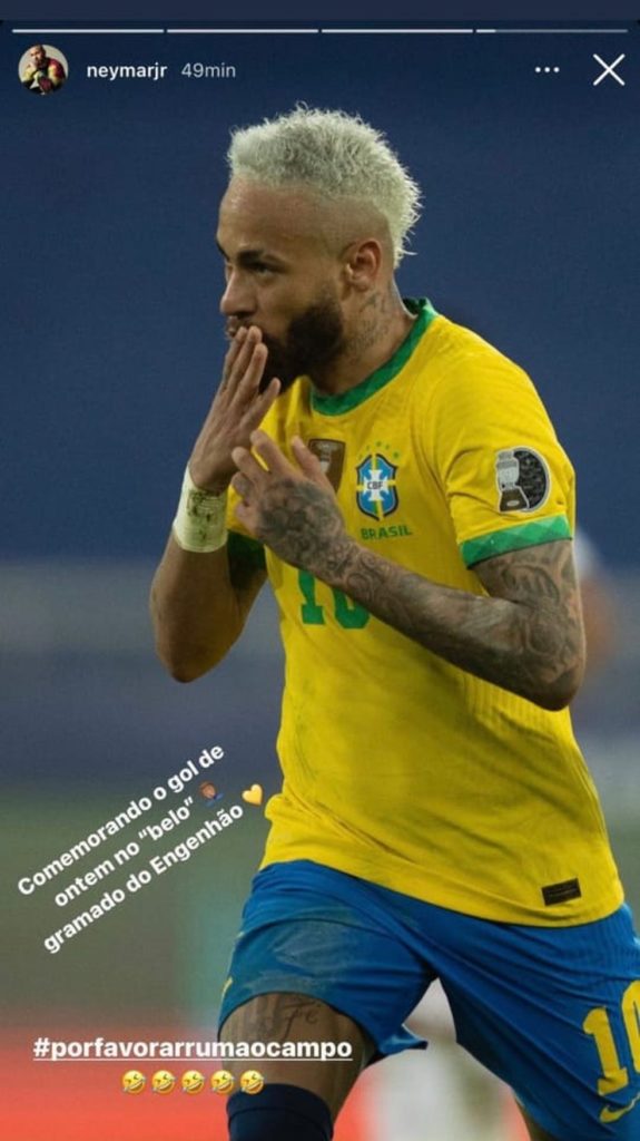 Apenas três dias adiante, mais uma partida. Desta vez, dos donos da casa. A seleção brasileira aplicou uma goleada por 4 a 0 sobre o Peru e foi a vez de o atacante Neymar fazer a crítica. Em um publicação em uma rede social, ele ironizou o estado da grama e pediu melhorias.