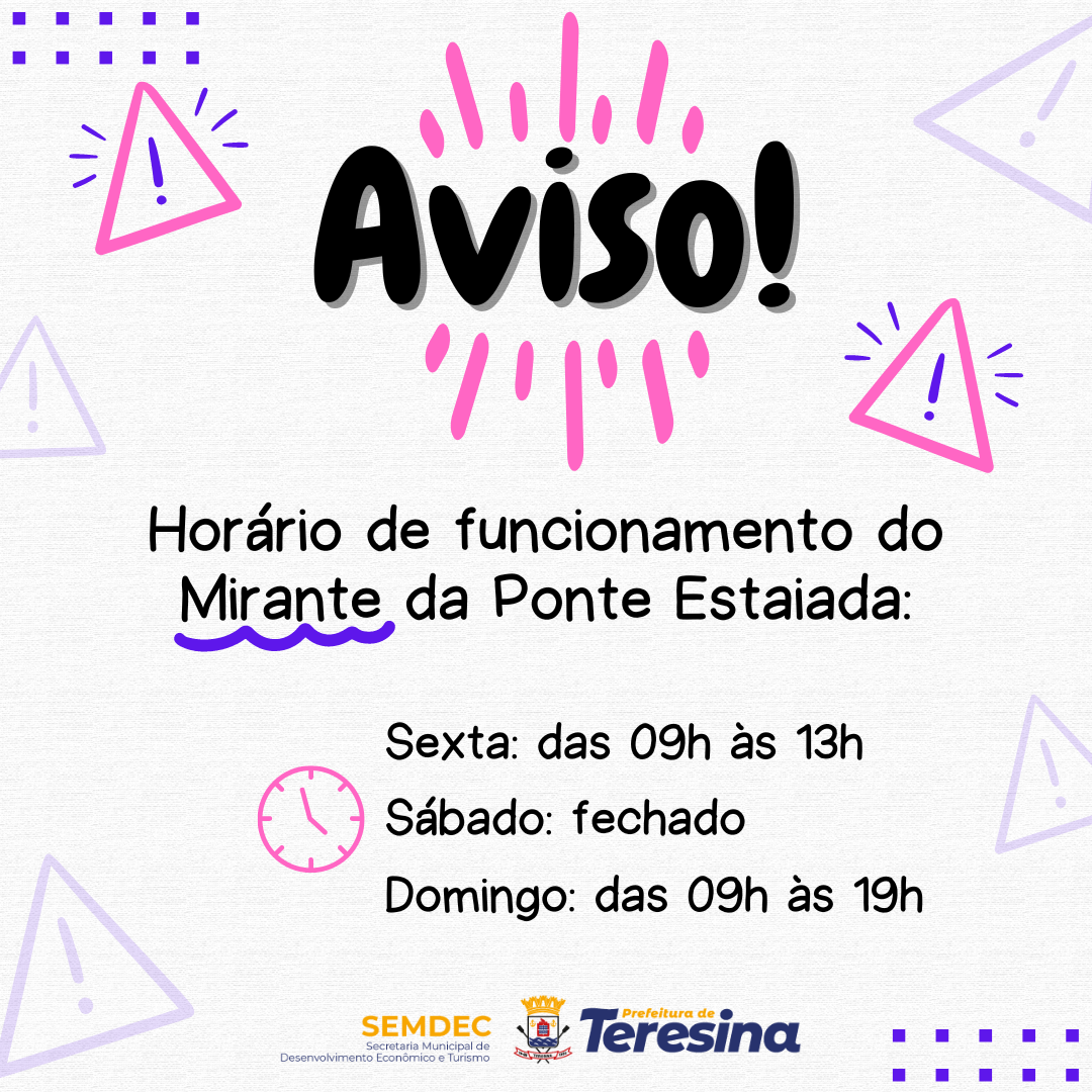 “Pedimos à população que observe os horários de abertura do acesso ao Mirante, que foram ajustados para atender ao bloqueio provocado pelo grande evento que está acontecendo na Avenida Raul Lopes. Teresina é, hoje, uma capital de eventos, os quais têm contribuído para atrair fluxo de outras localidades e injetar moeda nova em sua economia”, esclarece o coordenador de turismo da Secretaria Municipal de Desenvolvimento Econômico e Turismo, Eneas Barros.