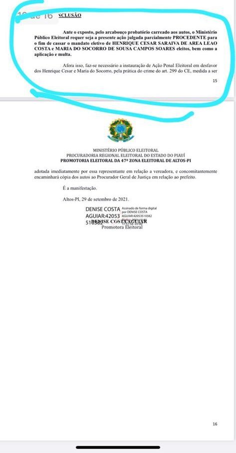 O mandato da vereadora Maria do Socorro de Sousa Campos Soares está sendo analisado pelo Juiz da comarca de Altos-PI.