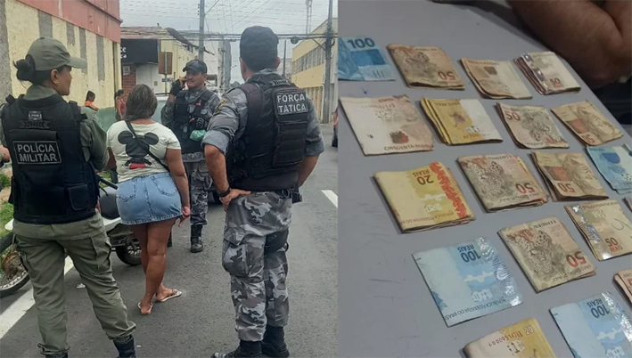 Porém, a polícia, ao verificar o sistema, constatou que dois celulares tinham restrição de roubo. Diante da situação, uma policial feminina fez busca pessoal em “Tieta” e encontrou a quantia de R$ 2.734,35 escondidos em uma sacola entre os seios da suspeita.