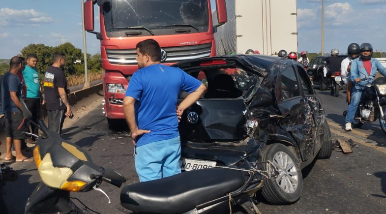 Mulher fica ferida após colisão entre carro e caminhão na Ponte do Tancredo Neves, em Teresina