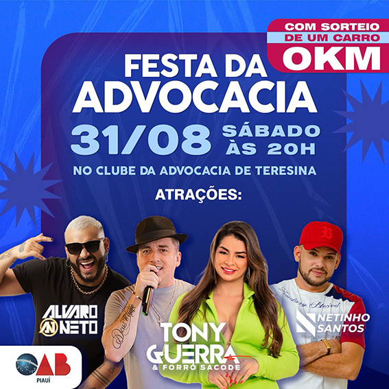 A programação da festa contará com apresentações de Tony Guerra & Forró Sacode, Netinho Santos e Álvaro Neto, prometendo uma noite de entretenimento para a advocacia piauiense.
