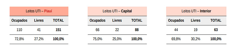 A situação também é complicada no Hospital Geral do Monte Castelo, em Teresina, onde 18 dos 19 leitos de UTIs estão ocupados. O Hospital Estadual Dirceu Arcoverde (HEDA), em Parnaíba, está com 80% das UTIs ocupadas.