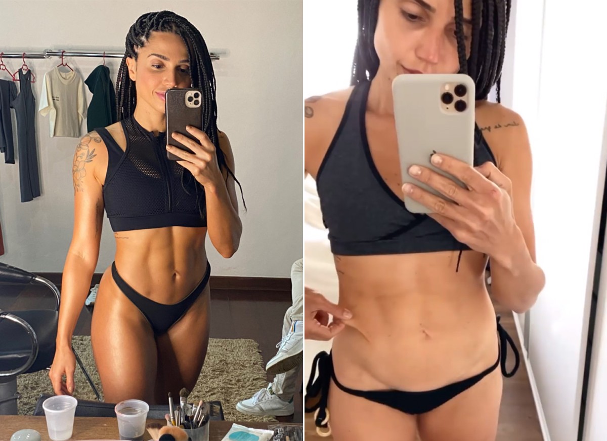 Inicialmente ela postou nos stories um vídeo em que aparece de top e calcinha, mostrando o corpo definidíssimo. Nos seguintes, ela já se apresenta bem mais sequinha e ainda falou sobre a flacidez, por ter perdido massa magra.