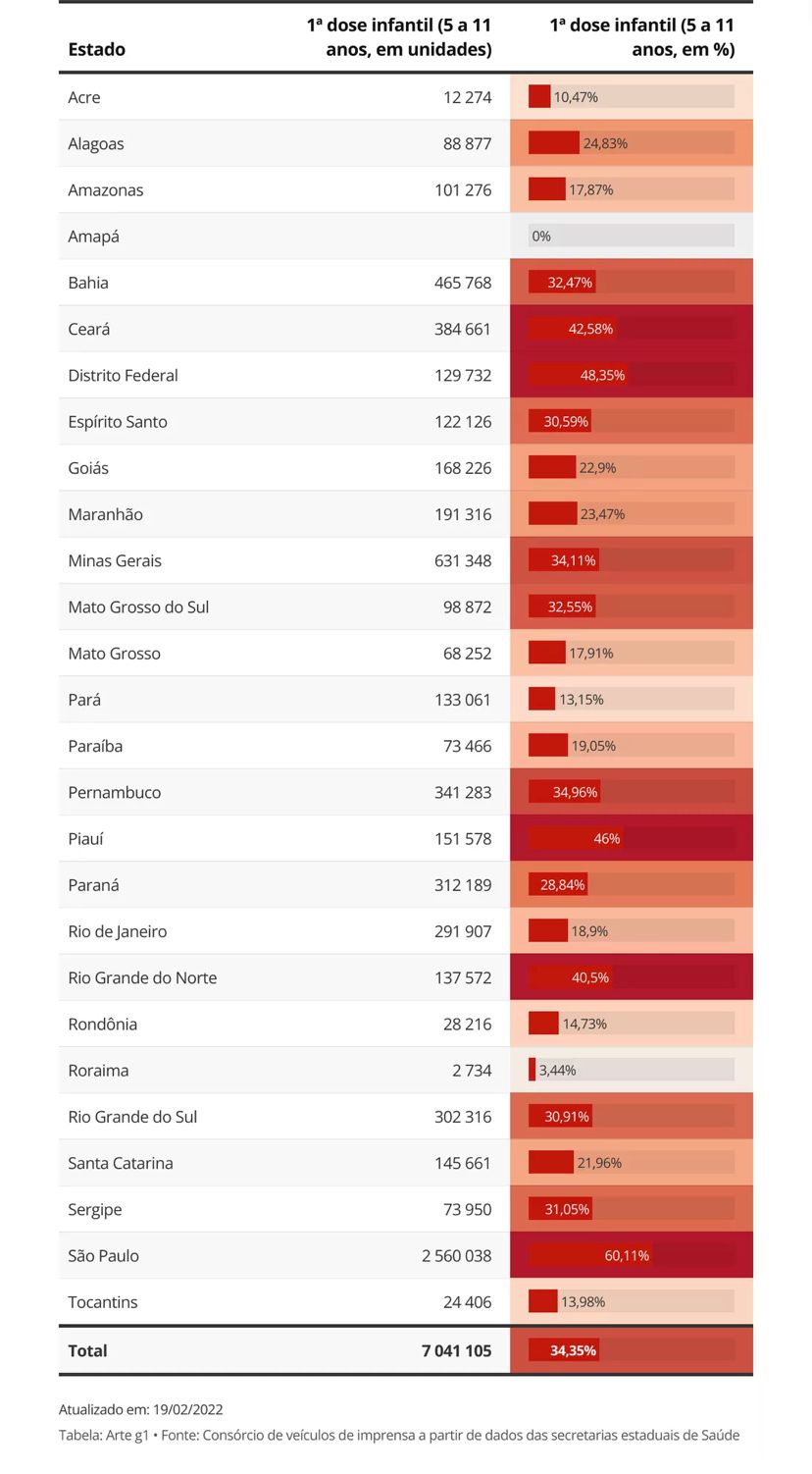 O levantamento é do Consórcio da Imprensa do dia 19/02/2022 que considera dados da vacinação de crianças entre 5 e 11 anos referentes aos estados e o Distrito Federal, com campanha de imunização iniciada este ano. O primeiro lugar do Brasil é São Paulo com 60% de crianças vacinadas e o segundo, o Distrito Federal, com 48,35%. No dia da divulgação dos dados, o Piauí estava com 46% de cobertura vacinal deste público.
