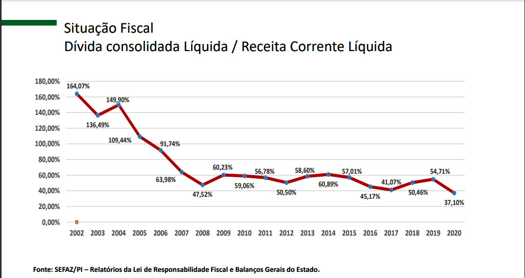 “O Piauí apresenta uma ótima situação fiscal, comparado com os anos anteriores, principalmente em 2002, quando, praticamente, atingiu o teto de 200% da Lei de Responsabilidade Fiscal (LRF). Vemos que passa a ter uma certa estabilidade em 2008, e nos últimos dois anos, o Estado apresentou queda no seu endividamento. Neste ano, já no primeiro quadrimestre, temos um percentual de endividamento menor do que em 2020”, explica Ricjardeson Dias, superintendente do Tesouro Estadual.