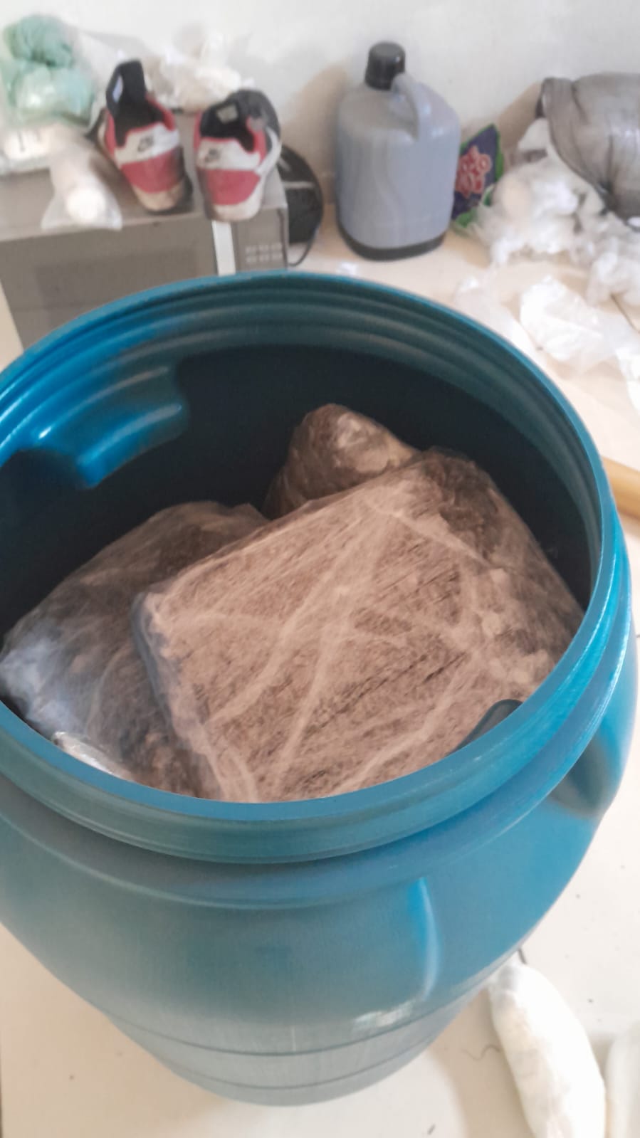 As drogas foram encontradas em uma espécie de tambor, utilizado para esconder e tentar disfarçar os entorpecentes. Além disso, foram encontradas facas escondidas dentro da residência, com munições de fuzil e carabina. A maconha foi encontrada dentro de uma caixa de isopor, juntamente com balanças de precisão.