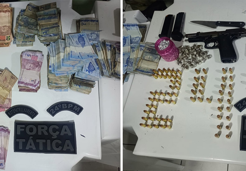 Junto aos suspeitos, foram apreendidas 116 munições para arma de fogo, uma pistola .40 e dois carregadores, mais de 330 drogas embaladas prontas para venda, 1 tablete de 250 gramas de substância análoga a maconha, 2 balanças de precisão, triturador de maconha, caderno com anotações e duas motocicletas.