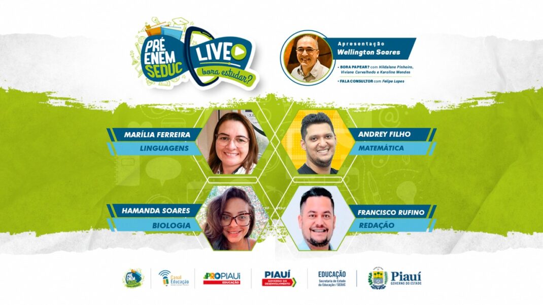 Na sexta (24), a partir das 8h às 13h, os estudantes podem assistir a aula realizada na 20ª GRE – Gerência Regional (Teresina Nordeste) com os conteúdos relacionados às disciplinas de Linguagens, pela professora Marília Ferreira; Física, com Élisson Araújo; Biologia, com Hamanda Soares; Matemática, com Márcio Jean; Química, com o professor Feijão; Ciências Humanas, com Thiago Ramos; e finaliza Redação, com Francisco Rufino. A revisão preparatória terá apresentação do coordenador do Pré-Enem Seduc, Wellington Soares.