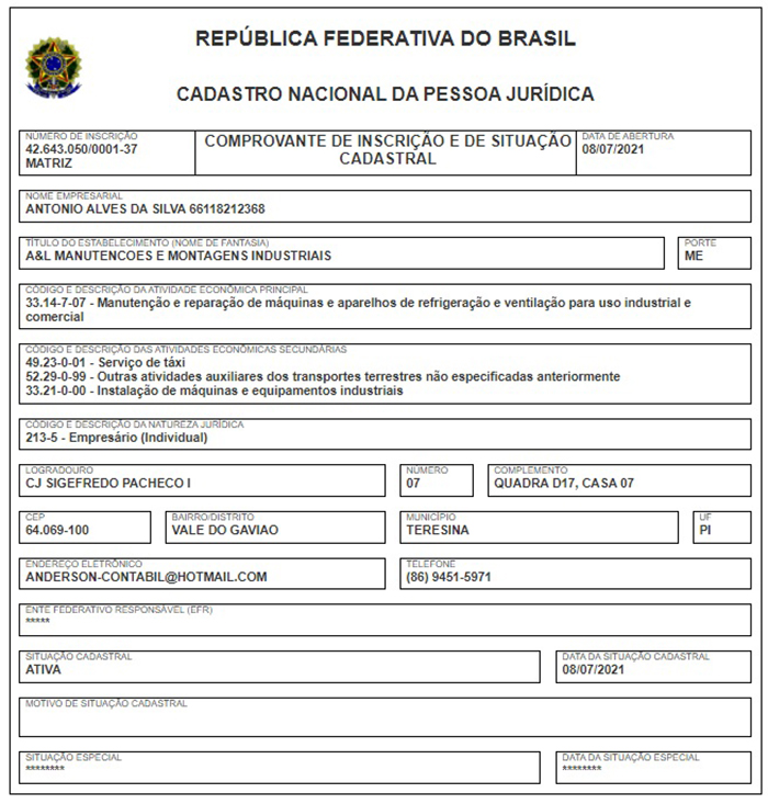A empresa Antônio Alves da Silva, com nome de fantasia A&L Manutenções e Montagens Industriais, foi aberta no dia 08 de julho e consta que sua atividade principal é a manutenção e reparação de máquinas e aparelhos de refrigeração. A sede da empresa fica localizada no Conjunto Sigefredo Pacheco I, bairro Vale do Gavião em Teresina.