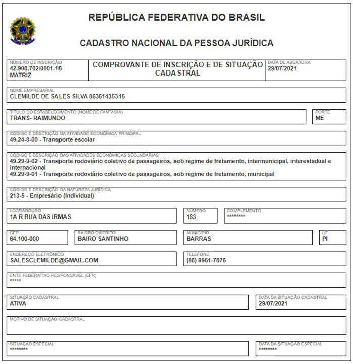 No dia 29 de julho foi aberta a empresa de Clemilde de Sales Silva, com nome de fantasia Trans-Raimundo, cuja atividade principal é o transporte escolar. Aqui, nota-se que existe uma incongruência no contrato firmado entre as partes. No extrato consta que a empresa foi contratada para transporte de cargas, no entanto, no CNPJ da Trans-Raimundo não consta que ela possa desempenhar tal atividade. Percebe-se aqui, uma possível ilegalidade no contrato firmado entre o prefeito e a empresa.