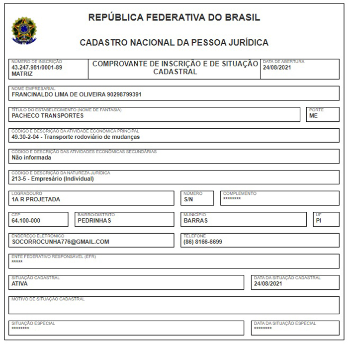 Por fim temos a empresa Francinaldo Lima de Oliveira, cujo nome de fantasia é Pacheco Transportes, que foi criada no dia 24 de agosto e tem por atividade principal o transporte rodoviário de mudanças.