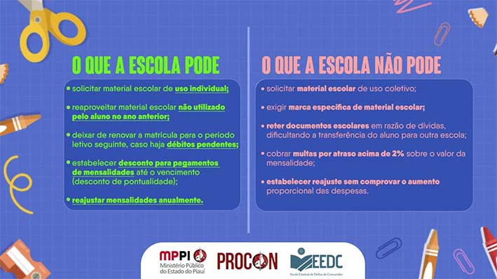 O Procon/MPPI ainda determinou que o plano de utilização elaborado pela entidade escolar fique afixado durante os dois primeiros meses de sua vigência em local público e de fácil acesso na instituição de ensino e, posteriormente, seja arquivado na secretaria para eventuais consultas e esclarecimentos, assim como para a comprovação de sua execução.