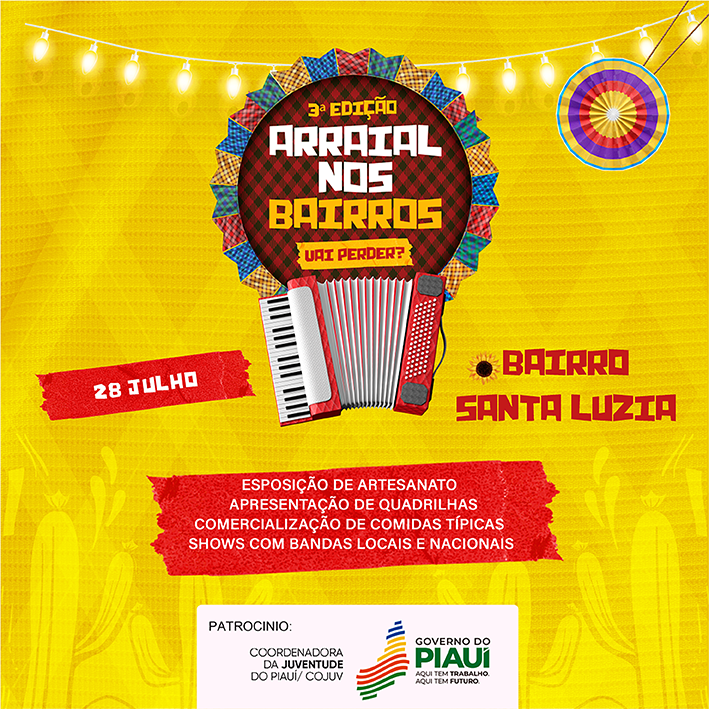 O Projeto “Arraial nos Bairros”, realizado pelo Governo do Estado, através da Coordenadoria da Juventude do Estado do Piauí, será atração para os moradores bairro Santa Luzia, na zona Leste de Teresina-PI, no dia 28 de julho.