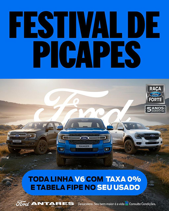 A Ford Antares promove o Festival de Picapes, no mês de dezembro, o destaque da campanha é a nova Ford Ranger V6 2026, a picape mais premiada da categoria. Durante o festival, os clientes têm acesso a condições exclusivas, como taxa zero e Tabela Fipe no seu seminovo, oportunidades pensadas para facilitar a troca de veículo e tornar o sonho da picape nova ainda mais acessível.