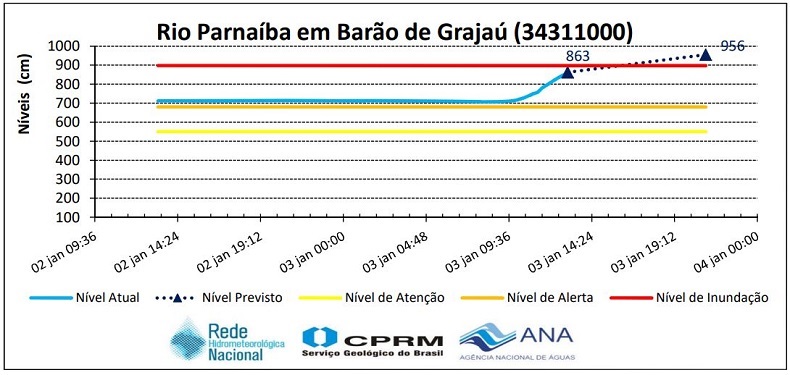 Na última medição, realizada pelo órgão por volta das 13h no ponto de monitoramento instalado em Barão de Grajaú, cidade do Maranhão vizinha à piauiense, o nível do rio era de 863cm, próximo a de inundação, que é 898cm.