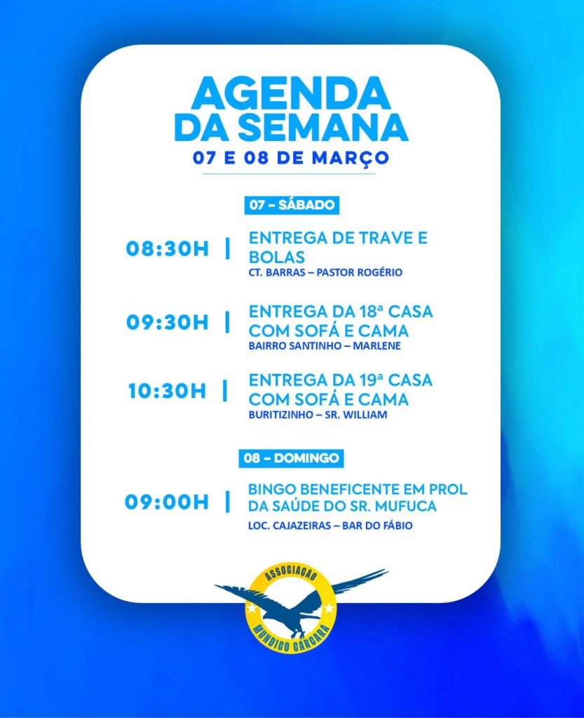 Já no domingo (8), a programação continua com a realização de um bingo beneficente em prol da saúde do senhor Mufuca, no povoado Cajazeiras, no Bar do Fábio.