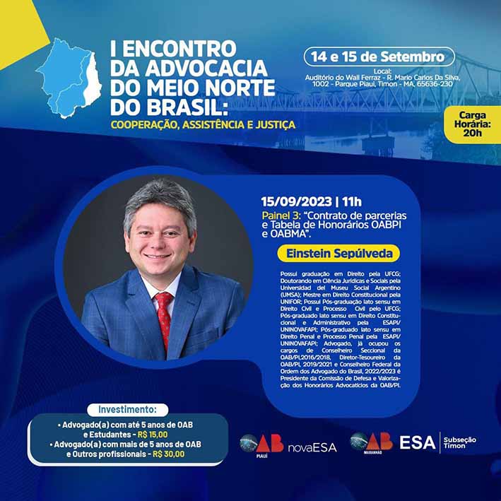 O I Encontro da Advocacia Meio Norte do Brasil é uma iniciativa que visa promover o intercâmbio de conhecimento, o debate construtivo e a atualização profissional na área jurídica. Com uma programação diversificada que abrange uma ampla gama de tópicos, desde as últimas tendências legais até desafios éticos e sociais, o evento busca oferecer uma experiência enriquecedora a todos os participantes.