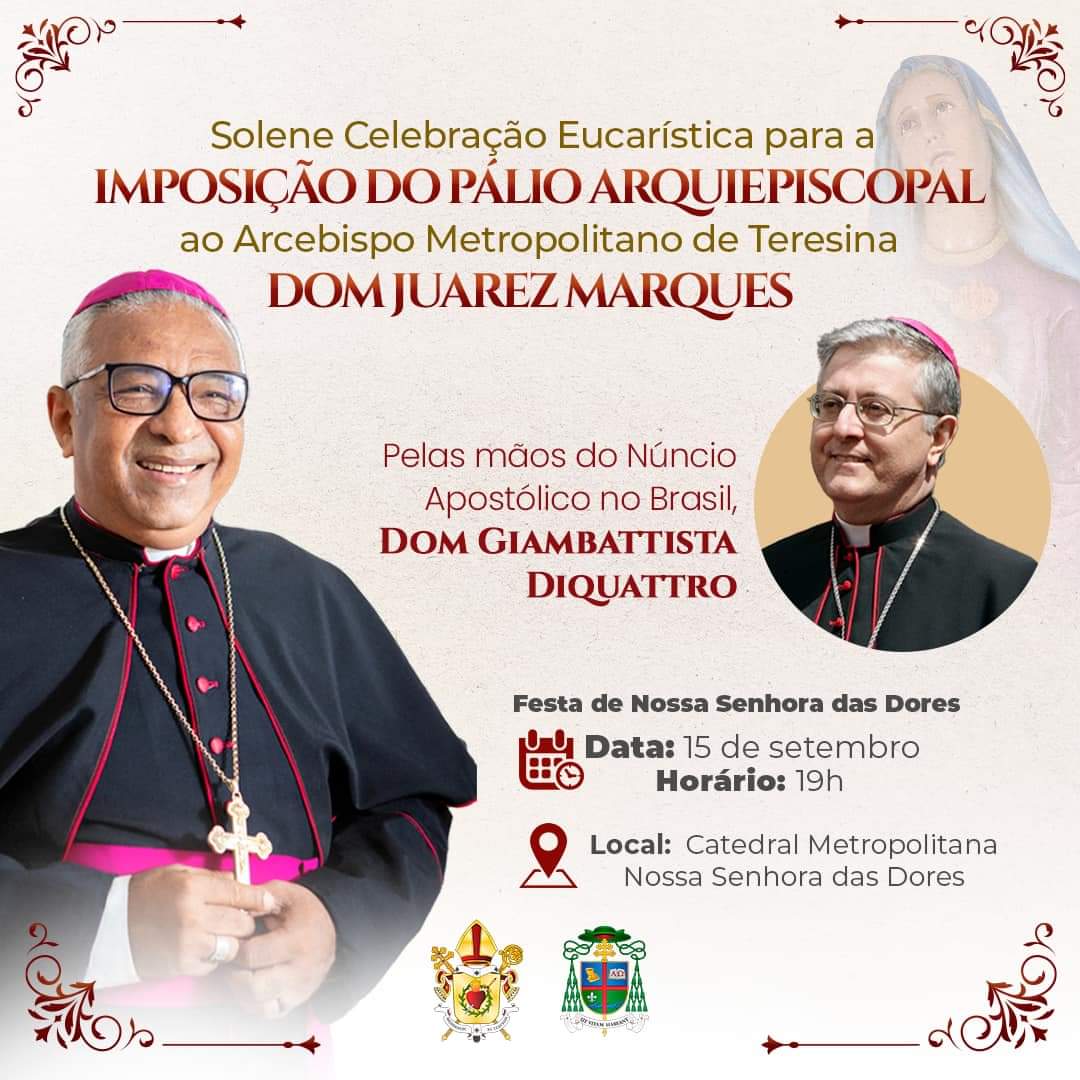 A Arquidiocese de Teresina viverá um momento histórico nesta sexta-feira, dia 15 de setembro, durante a festa da Padroeira Nossa Senhora das Dores. O Arcebispo Metropolitano, Dom Juarez Marques, primeiro piauiense a chefiar a Igreja de Teresina, receberá a imposição do Pálio Episcopal das mãos do representante do Papa no Brasil, o Núncio Apostólico Dom Giambattista Diquattro. A celebração eucarística terá início às 19h na Catedral de Teresina, localizada na Praça Saraiva (Centro). Todos são convidados a participar deste momento que marca a história da Igreja no Piauí.