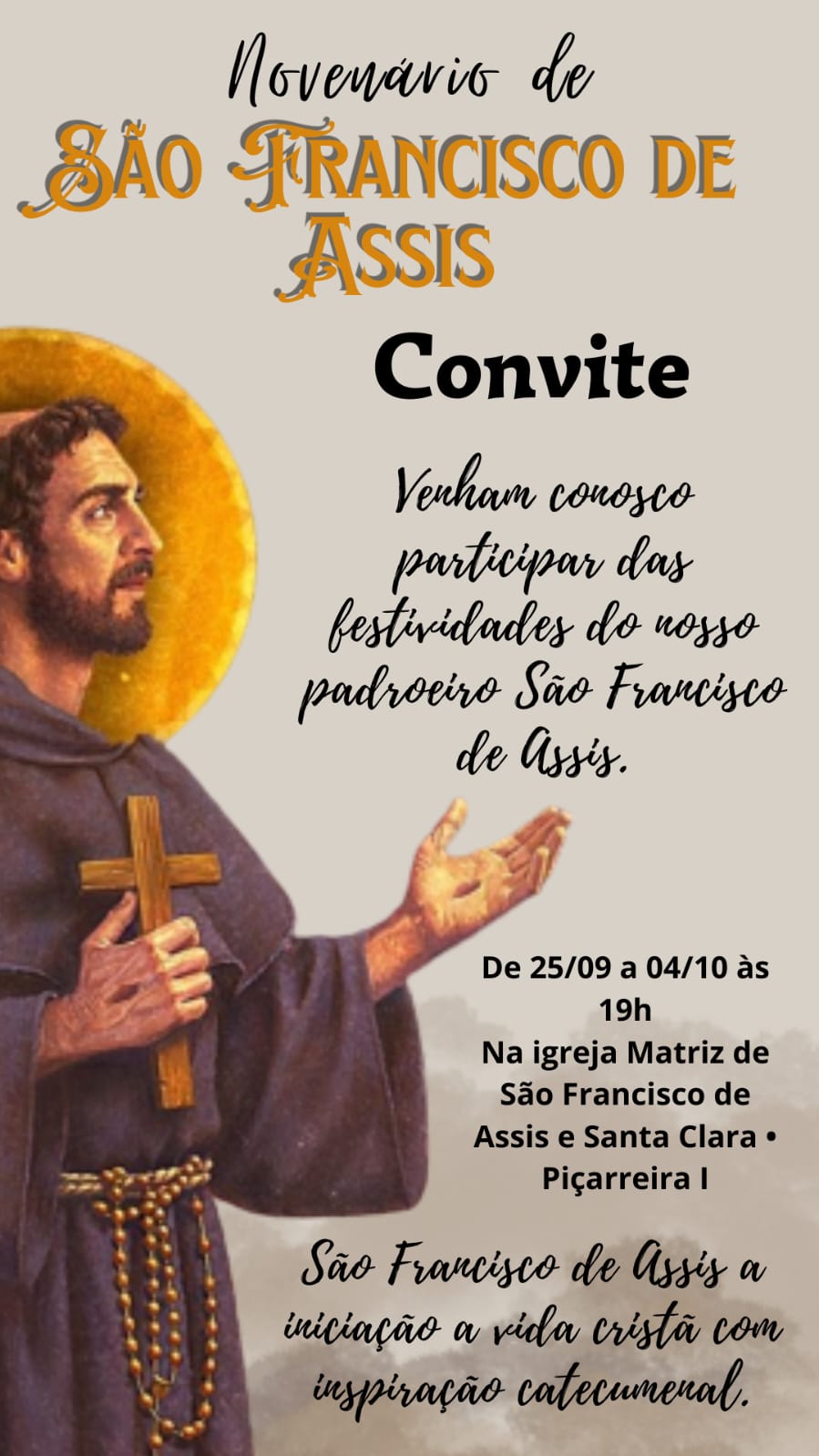 Os festejos de São Francisco De Assis serão iniciados hoje ás 19 h na igreja Matriz de São Francisco e Santa Clara no bairro Piçarreira I .