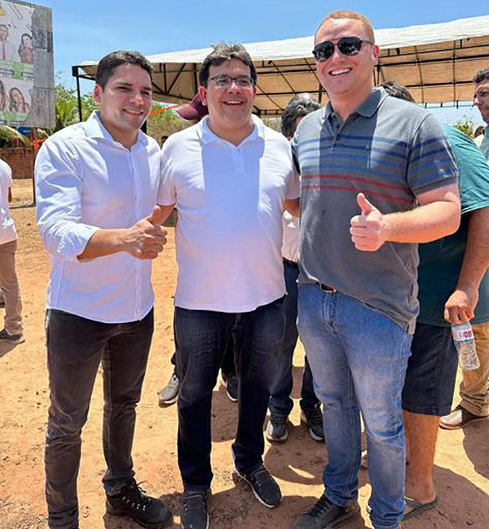 O Diretor Geral do Departamento de Estradas e Rodagens do Estado (DER-PI), Leo Sobral, com o vereador Venâncio Cardoso e o governador Rafael Fonteles durante visita a cidade de Batalha (PI). Na oportunidade, o governador inaugurou a recuperação das rodovias que ligam Batalha/ Barras e Batalha/Piracuruca.